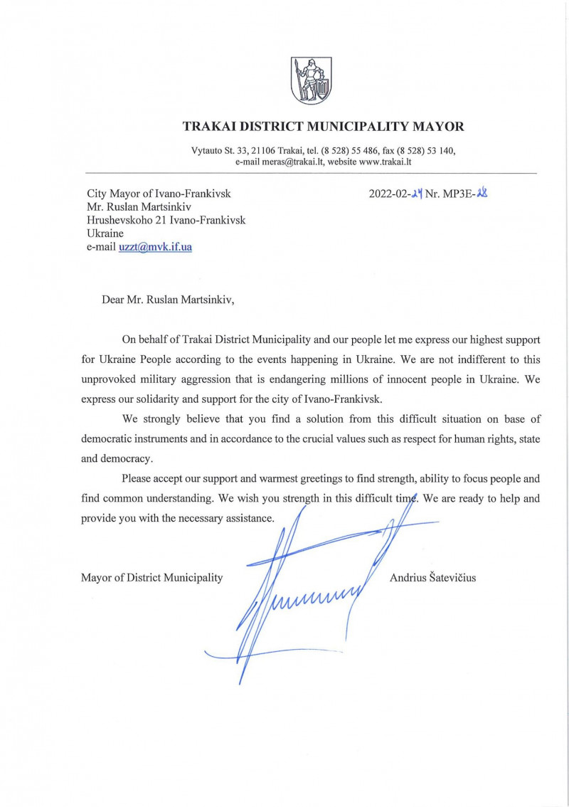 The sister city of Ivano-Frankivsk, Tarkai (Lithuania), expressed support for the situation in Ukraine. Our partners are ready to support the Ukrainian people and the residents of Ivano-Frankivsk.
